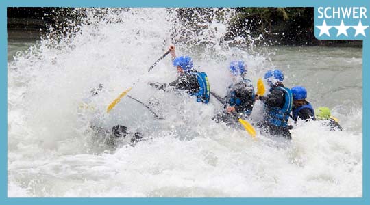 Rafting ist ein Teamsport, alle wirken durch paddeln an der Fahrt mit. Die Fahrt wird von einem qualifizierten Bootsführer begleitet.